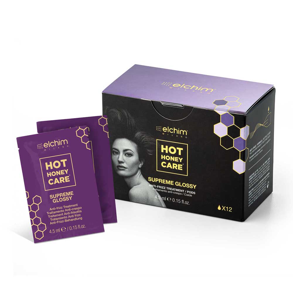 Hot Honey Care Supreme Glossy is ontstaan uit de Elchim-laboratoria, de enige 3-in-1-behandeling voor drogen, stylen en behandelen in één enkele beweging. De behandeling, gecombineerd met het gebruik van de haardrogers van Elchim, transformeert het haar tijdens het drogen en stylen met een onmiddellijk effect . De warmte en luchtstroom van de haardroger activeren de principes van de peulen tijdens het drogen, stylen en behandelen van het haar in één snelle stap, met perfecte uniformiteit. Door de Supreme Glossy-pod in de speciale cosmetische concentrator voor uw Elchim-föhn te plaatsen, krijgt u onmiddellijk een zichtbaar antikroeseffect met zachter en glanzender haar.