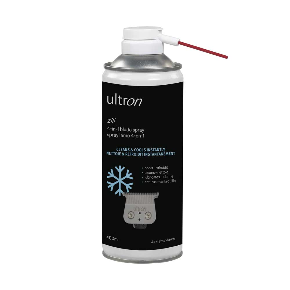 Ultron ZILI Cool Blade Spray 4-in-1 blaast haar, stof en deeltjes van de messen. Zorgt voor smering van de tondeusebladen bij het knippen, trimmen en voorkomt roest. Onze antiroestformule beschermt de bladen en verlengt de levensduur van je tondeuse. De spray zorgt voor een gemakkelijke glijbeweging voor ultieme precisie en een comfortabele snit voor je klanten. De spray koelt de bladen af na gebruik van het tondeuse.