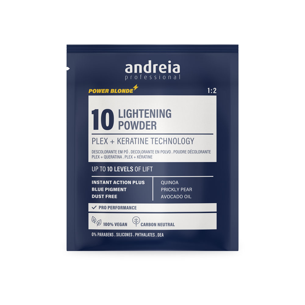 Het vegan blauwe bleekpoeder van Andreia Professional kan het haar tot 10 tinten lichter maken met professionele prestaties en maximale bescherming van de haarvezels. Het is ontwikkeld met PLEX-technologie en keratine en beschermt de binnenste structuur van het haar, waardoor de keratinebindingen tijdens het bleken behouden blijven. Deze geavanceerde bescherming minimaliseert haarbreuk en behoudt de integriteit van het haar, waardoor een stralend resultaat wordt gegarandeerd zonder de gezondheid van het haar aan te tasten. Het blauwe pigment neutraliseert effectief gele ondertonen en zorgt voor een puur, koel blond resultaat. De onmiddellijke werking en stofvrije formule maken het proces schoon, gemakkelijk en snel, terwijl het stabiele mengsel niet zwelt, lekt of druipt. Hierdoor heeft u in elke fase volledige controle. Ideaal voor professionele bleekbehandelingen en geschikt voor alle technieken, inclusief freehand haarkleuring, zonder het haar te verkleuren. Dit met quinoa, cactusvijg en avocado-olie verrijkte poeder voedt en beschermt het haar tijdens het chemische proces en helpt de natuurlijke elasticiteit en glans te behouden. De veilige en effectieve formule is geschikt voor alle haartypes en behoudt de integriteit van het haar terwijl het een maximale, gelijkmatige lift geeft. Met een verhouding van 1:2 is LIGHTENING POWDER 10 POWER BLONDE de perfecte keuze voor ultralichte blond tinten en zorgt het voor een gezonde, levendige en stralende finish.