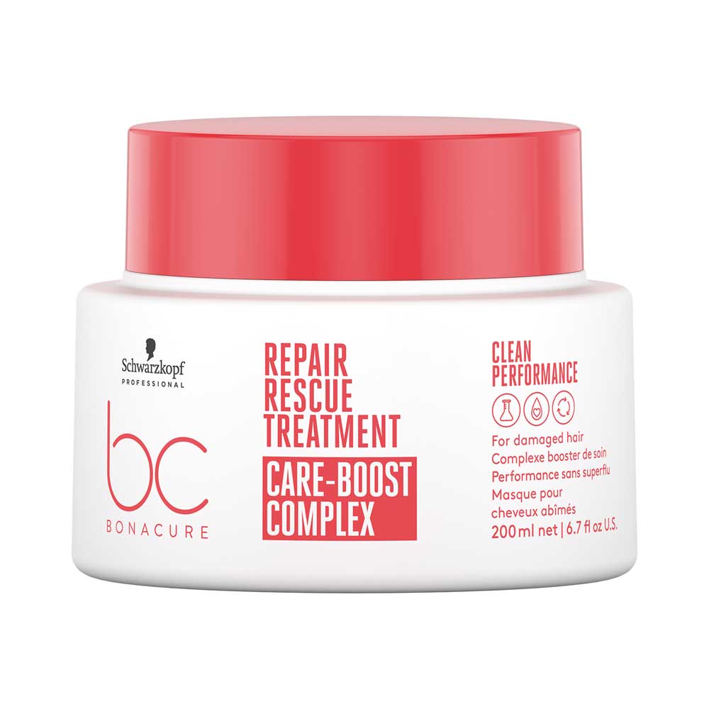Een herstellende behandeling voor beschadigd haar, Bonacure Repair Rescue Treatment bevat een vernieuwde formule met de Care Boost Complex die een hoger niveau van verzorging en diepe conditionering biedt, terwijl het haar licht en luchtig blijft.