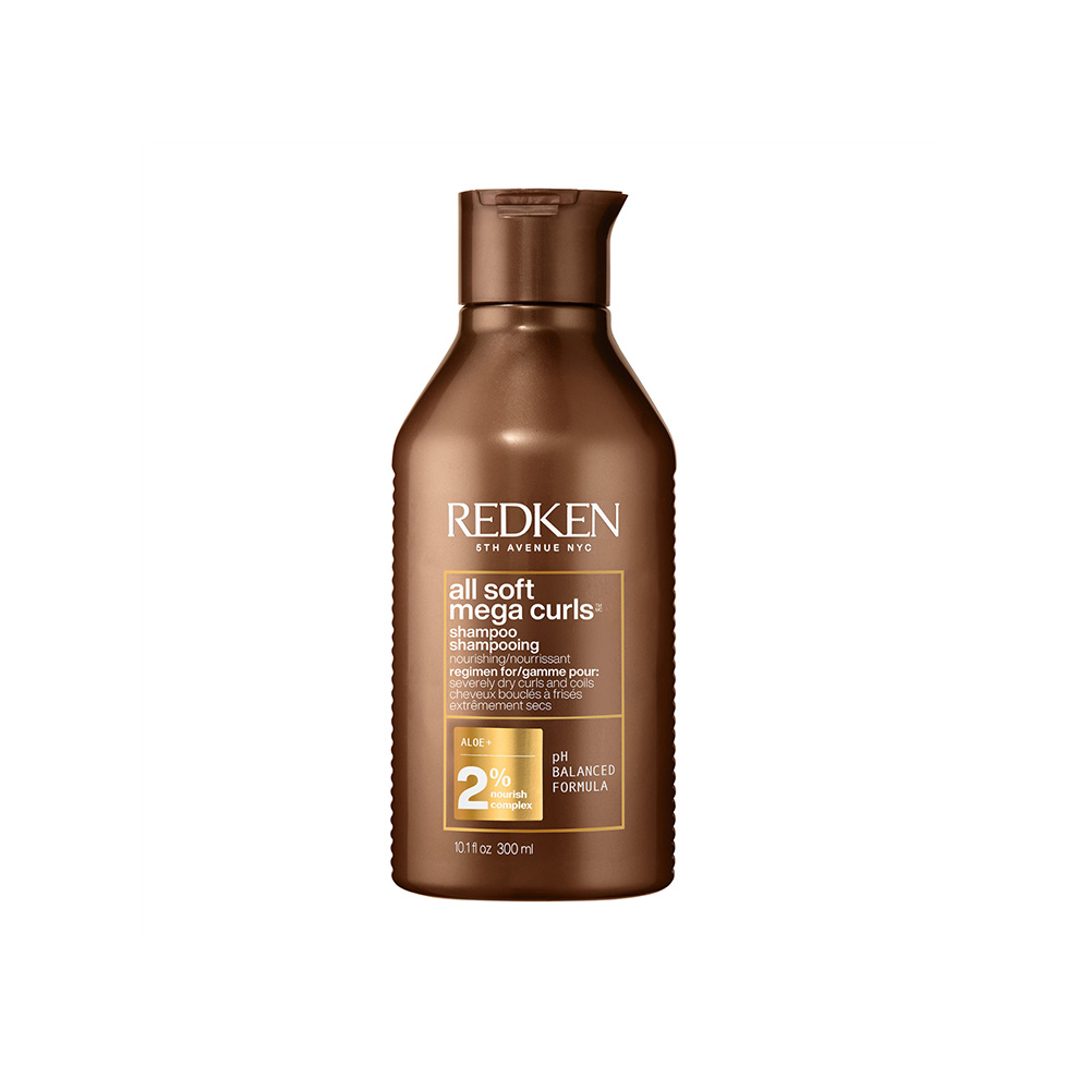 "All Soft Mega Curls Shampoo De oude bekende All Soft Mega formule is geoptimaliseerd voor krullen. De shampoo geeft een zachte reiniging, terwijl hij ook intens voedt en zachtheid geeft aan extreem droge krullen en kroeshaar*. De formule bevat Redken's exclusieve Nourish Complex en Aloë Vera, bekend om te hydrateren, versterken en behouden van vocht en zachtheid gedurende de hele dag.