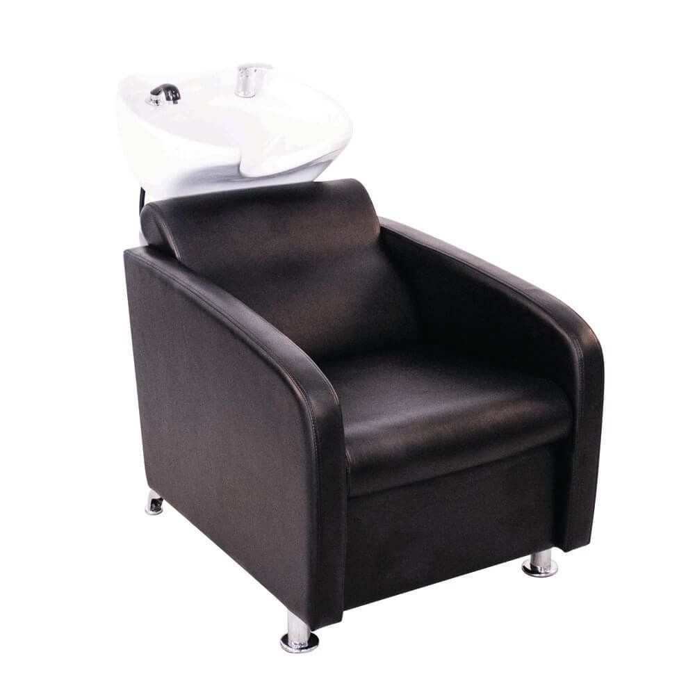 De Emma-spoelunit is ontworpen om te passen bij de Emma-stylingstoel, met de zacht gebogen armleuningen en speciale lendensteun. De wasbak kan worden gekanteld voor het comfort van de klant en er is een mengkraan met één hendel en een doucheslang.